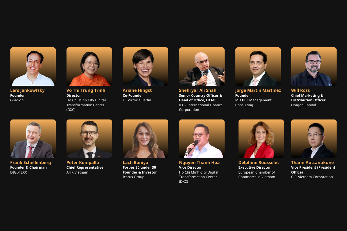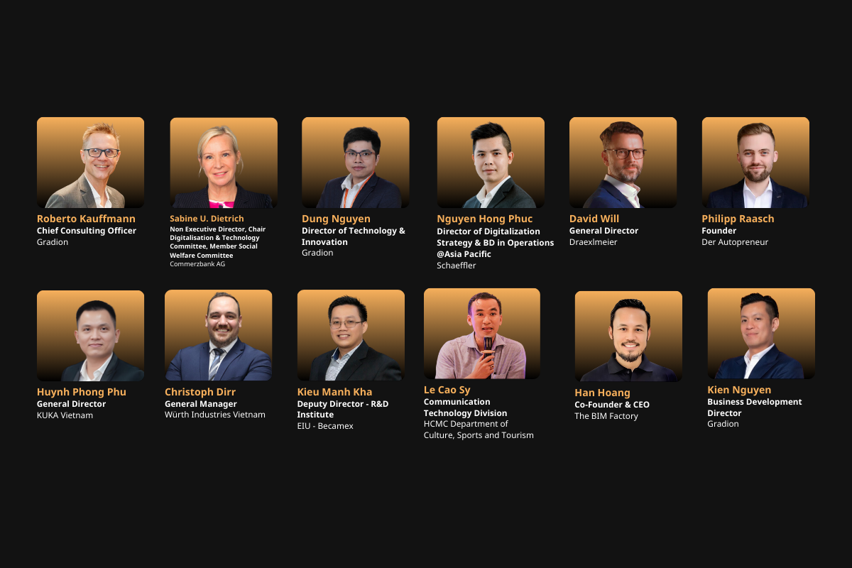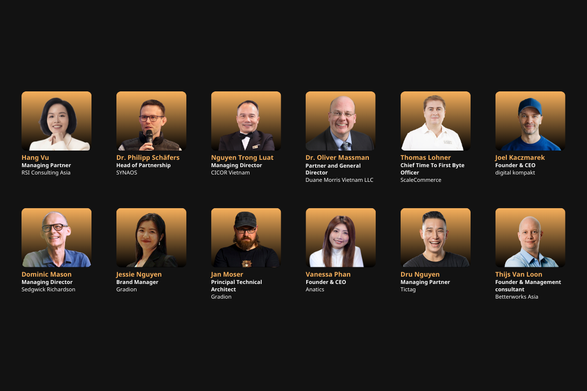 Speaker: Kien Nguyen - Business Development Director at Gradion | David Will - General Director at DRÄXLMAIER | Nguyen Hong Phuc - Director of Digitalization Strategy & Business Development in Operations @Asia Pacific at Schaeffler | Huynh Phong Phu - General Director at KUKA Vietnam | Dr. Lennart Bochmann - CPO, CRO & Co-Founder at SYNAOS